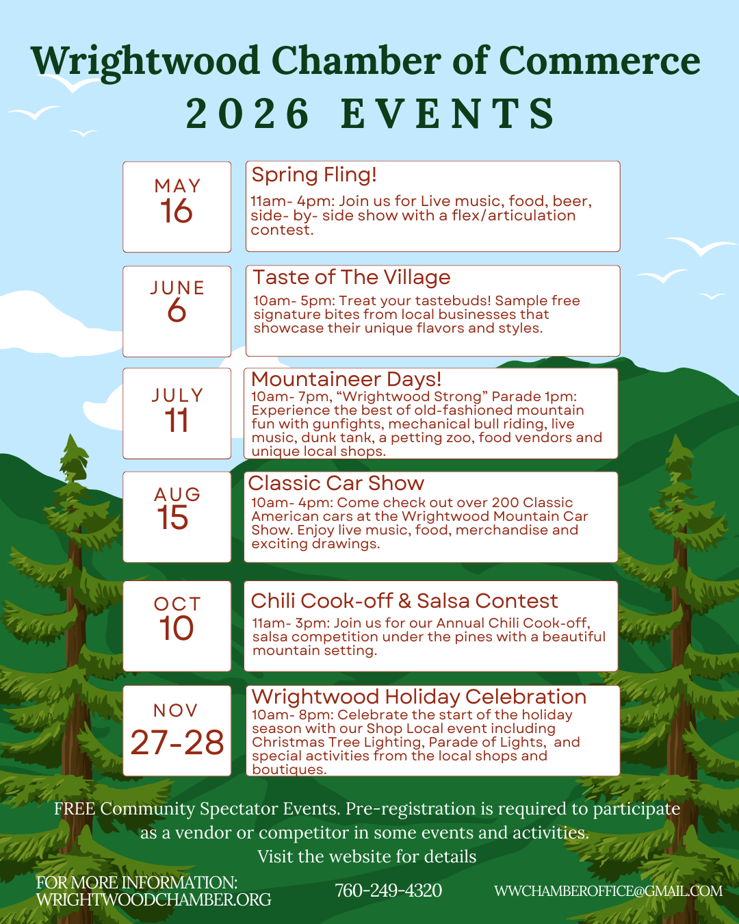 This fun fall event features chili and salsa sampling, live music, and much more. Residents are encouraged to enter with their own family recipes, or participate in voting for the best chili and salsa in Wrightwood!